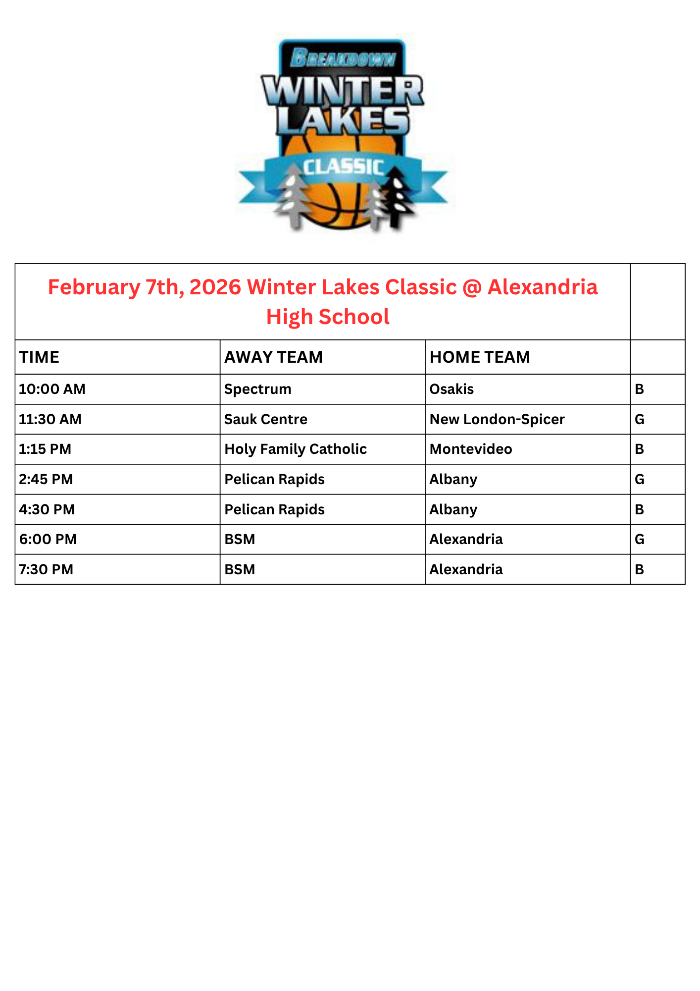 The Winter Lakes Classic is another of our special annual basketball events! In mid-February, we bring teams from across the state to the beautiful new Alexandria High School facilities for a day of top basketball. There will be varsity games, as well as JV, sophomore and freshman level games in the auxiliary gym. It promises to be a highly-anticipated and exciting time for basketball fans from around the state.